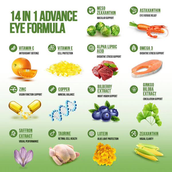 Our comprehensive eye support supplement combines 14 scientifically-backed ingredients in one powerful formula, designed to protect and enhance your vision from multiple angles.